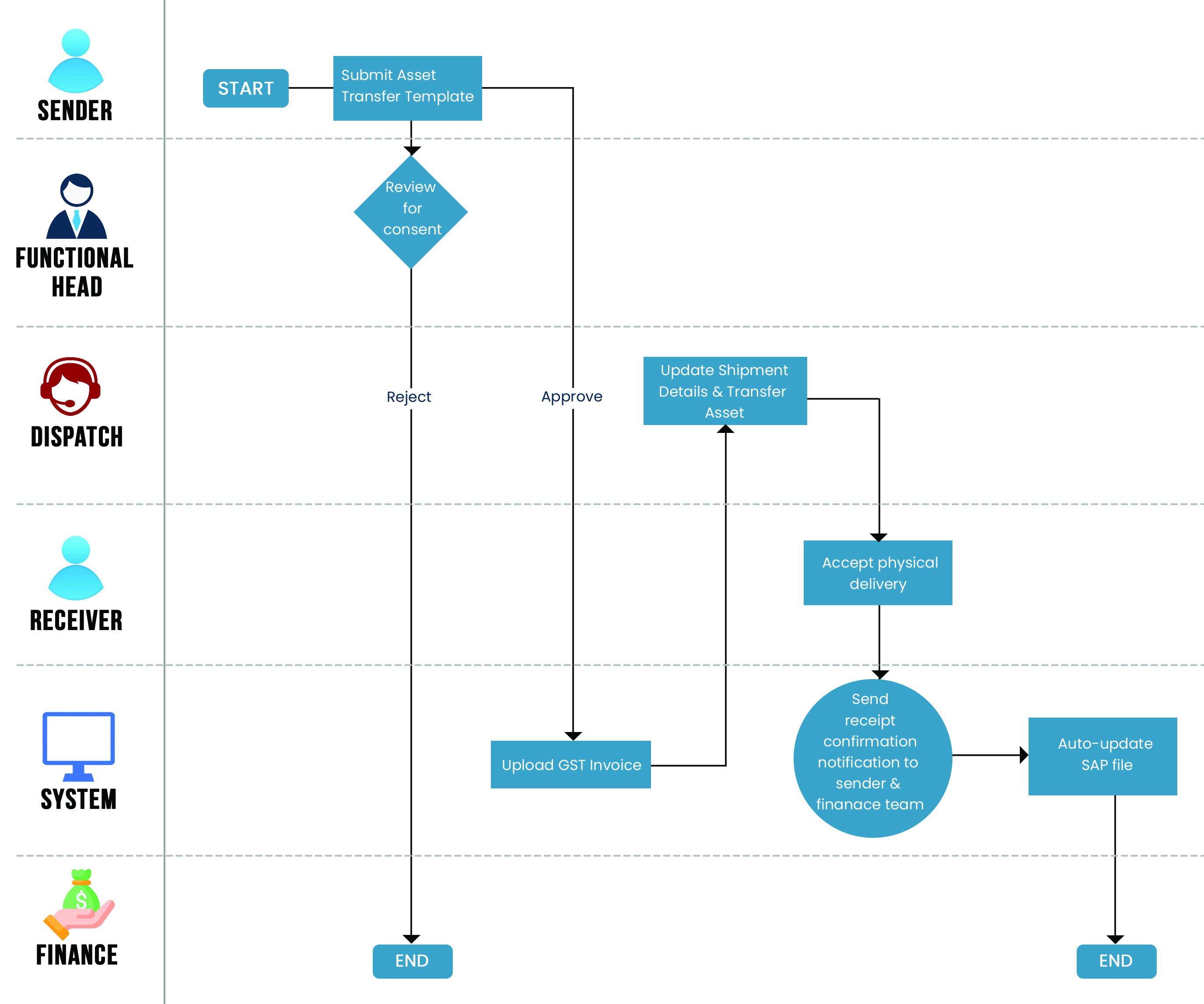 - The process involved the User department or Sender raising a ticket and filling in the Asset Transfer Template to transfer the assets.